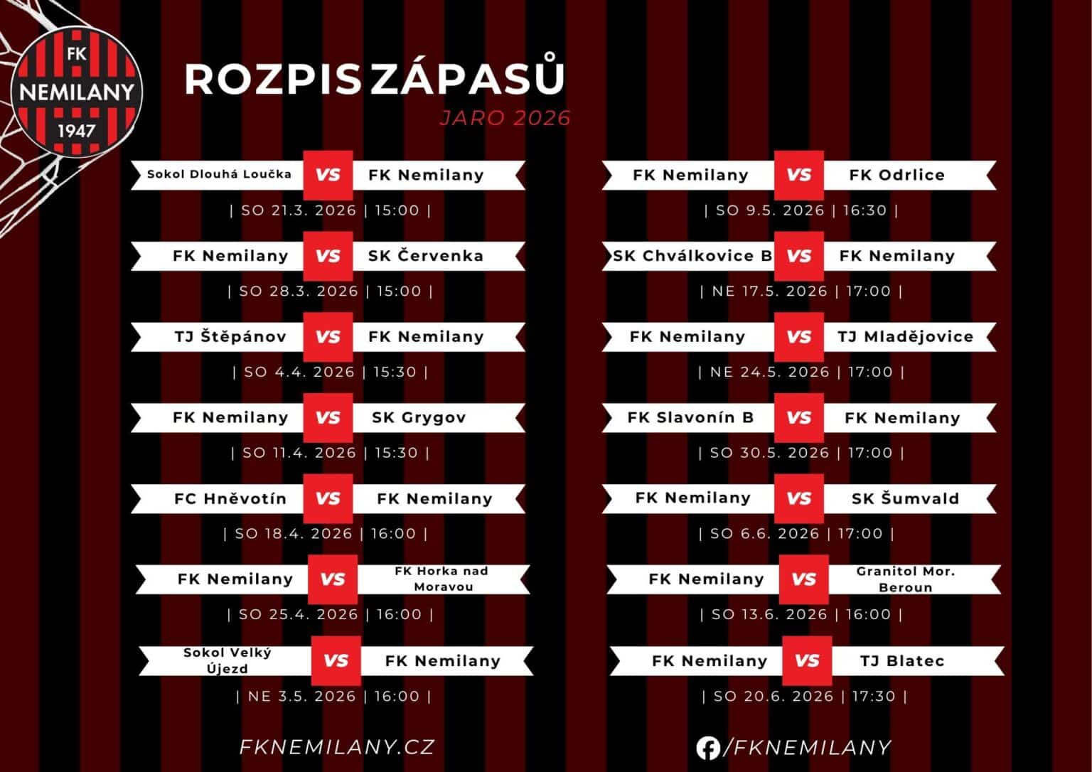 FK Nemilany zve všechny obyvatele Nemilan i blízkého okolí na jarní část fotbalové sezóny 2026. Připravili jsme pro vás kompletní rozpis domácích i venkovních utkání, díky kterému si můžete naplánovat sportovní odpoledne plná emocí, bojovnosti a dobré nálady. Domácí zápasy v areálu FK Nemilany tradičně nabídnou nejen kvalitní fotbal, ale také příjemné zázemí pro celé rodiny.