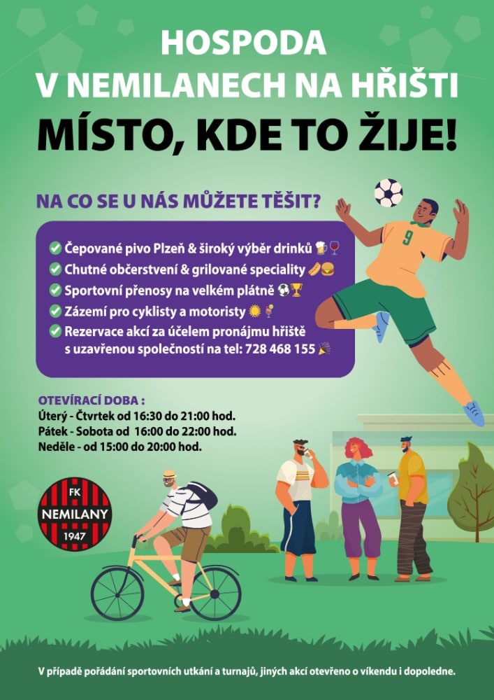 Naše hospůdka je úzce spojená s činností fotbalového klubu FK Nemilany, který má více než 75letou tradici. Během zápasů a jiných sportovních akcích, tu zažijete pravou sportovní atmosféru – od mládeže až po dospělé, od radosti z gólů až po nadšení fanoušků!